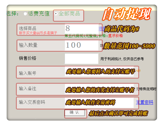 提现方式:在手工充值页面,商品编码填写数字8,数量填写就是你要提的金额,必须是100 的倍数,提现范围:[100-5000]。充值账号填写支付宝账号,备注填写支付宝对应的真实姓名。 提现30分钟内完成,时间是下午1点-4点的,每日只限一次!谢谢代理配合