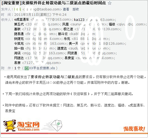 淘宝最新发布关于充值软件返点政策,要求所有充值软件取消二级返点和代理转账。 以下为淘宝邮件原文
